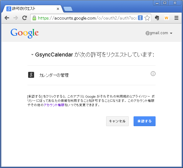 初回のみブラウザが開き、GsyncCalendarのアクセス許可が求められます。